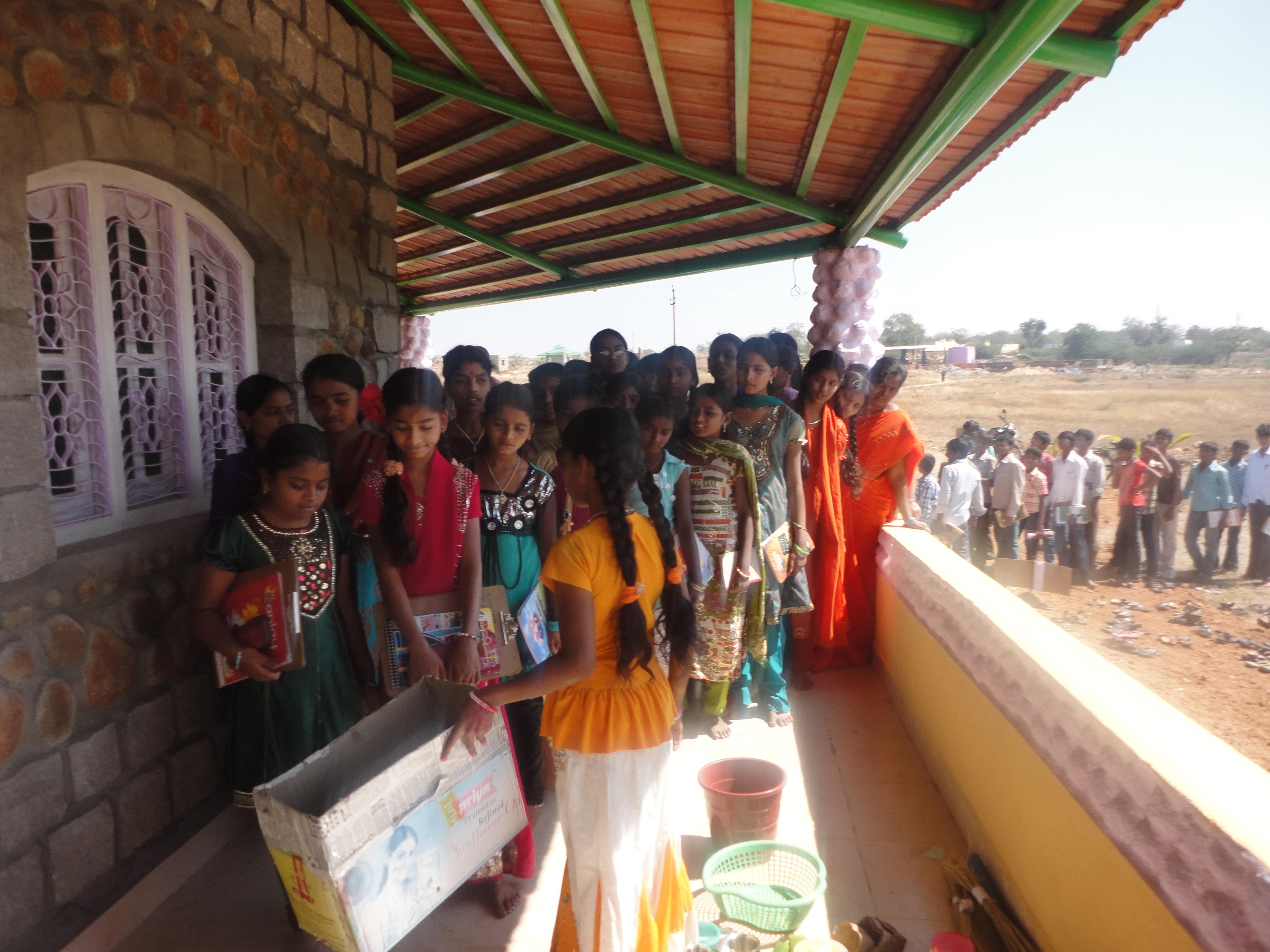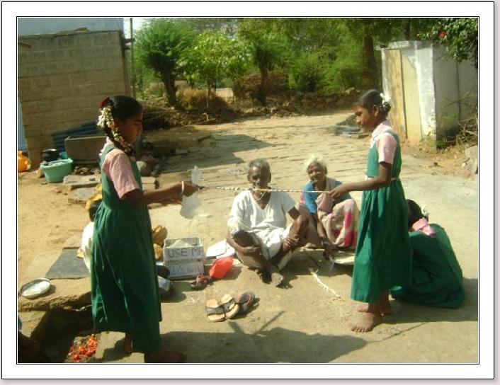 To realize this vision different activities were arranged in the school like preparation of paper bags and cotton bags and ropes of plastic covers. The drilling of ropes was the very first recycling of plastic done by our students. As well this first project week was the first time for the children taking action outside of the school premises: they went to the S. C. Colony nearby (Scheduled Castes Colony) to teach the inhabitants about the dangers of plastic garbage and to show to them the preparation of the above mentioned items. It was a great experience for the students to teach this practical and theoretical knowledge to older persons strengthening their self confidence. On the third day a rally through the town of Mudigubba was performed, teachers and students showing pamphlets, cotton bags stitched by the teachers, paper bags made by the students and plastic covers to illustrate the difference. Some important officers were visited and given pamphlets with compact information about the dangers of plastic garbage; some interviews with officers took place: Mother Earth and the Plastic Monster (both 7th class students) shared their knowledge. The newspapers gave reports regularly about the conscious widening activities of this week inspired by Headmaster Raja Sekhar with his “burning desire” for a clean Mudigubba.